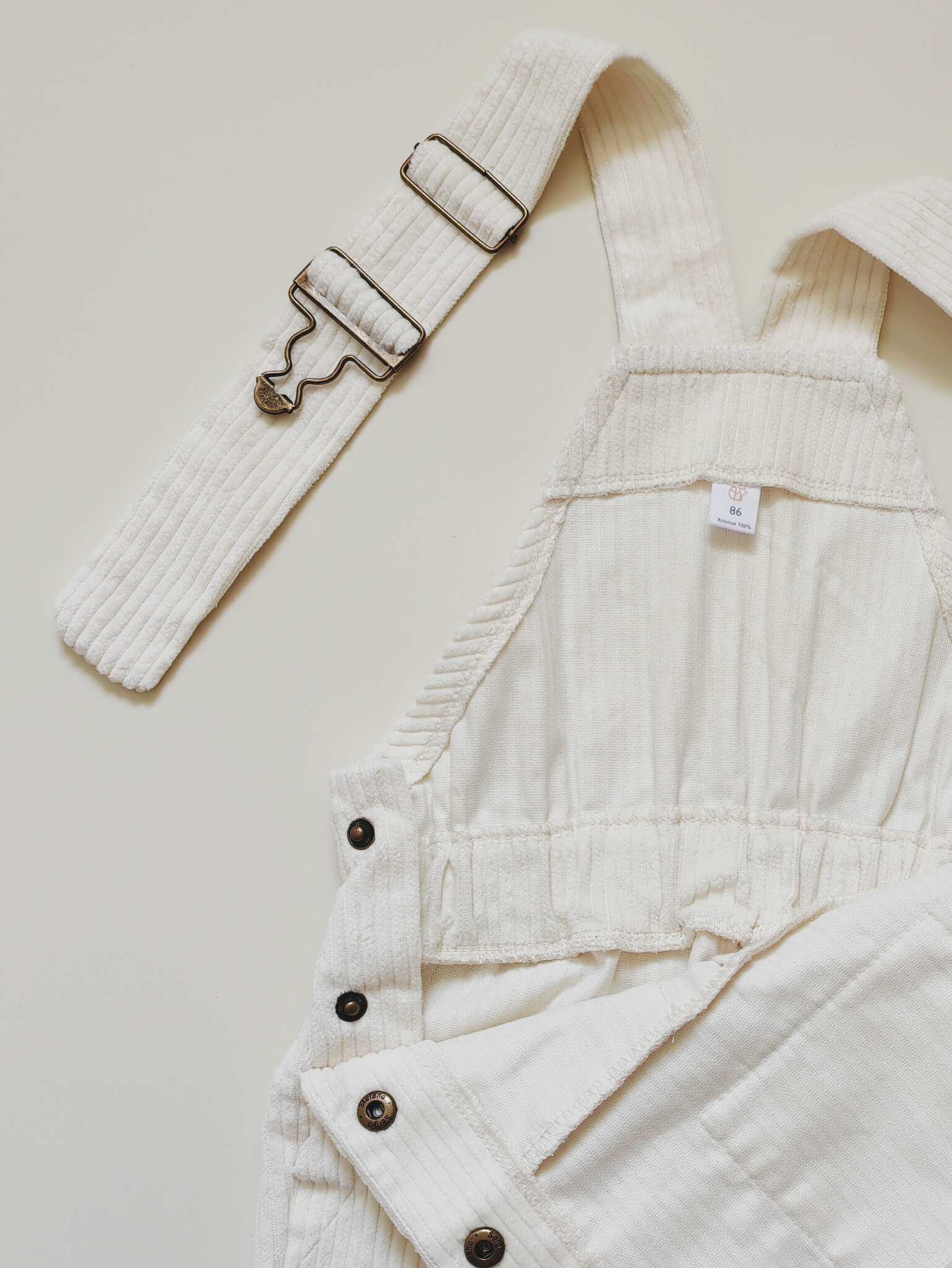 Комбинезон выполнен из 100% хлопкового вельвета. Эта универсальная модель прекрасно подойдет для прогулок и активных игр, а также будет отлично смотреться на празднике или фотосессии благодаря выразительной фактурной ткани. Комбинезон благородного молочного оттенка - незаменимая база для создания как праздничных, так и повседневных образов.